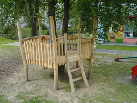 Die auf 1 m Höhe liegende Plattform umschließt einen Baum. Zwei Sprossen dienen als Aufstieg. Eine Brüstung umschließt die Plattform.