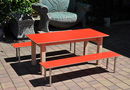Platten aus Kunststoff, Bankfüße aus Niro/Stahl, Tischfüße aus Lärche massiv, natur.